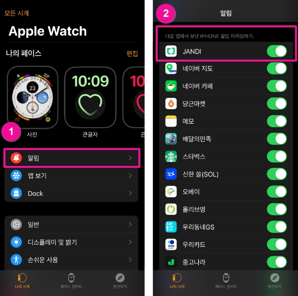 - Watch 앱에서 [알림] – ‘다음 앱에서 보낸 IPHONE 알림 미러링하기’에서[JANDI] 활성화