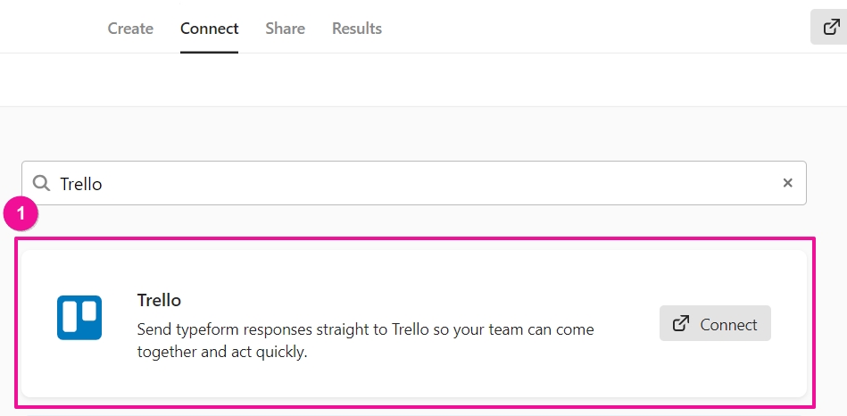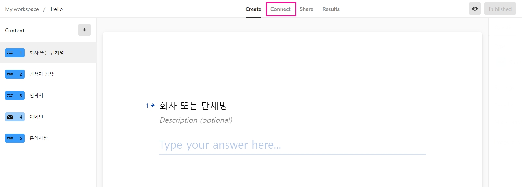 1) Published 된 타입폼 설문에서 [Connect]를 클릭해 주세요.