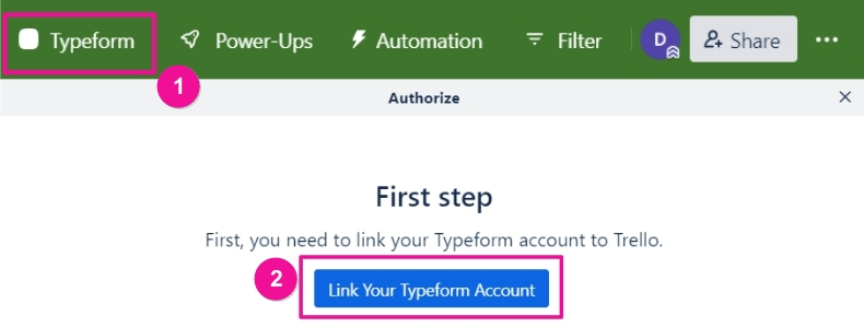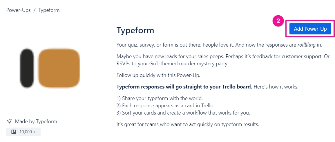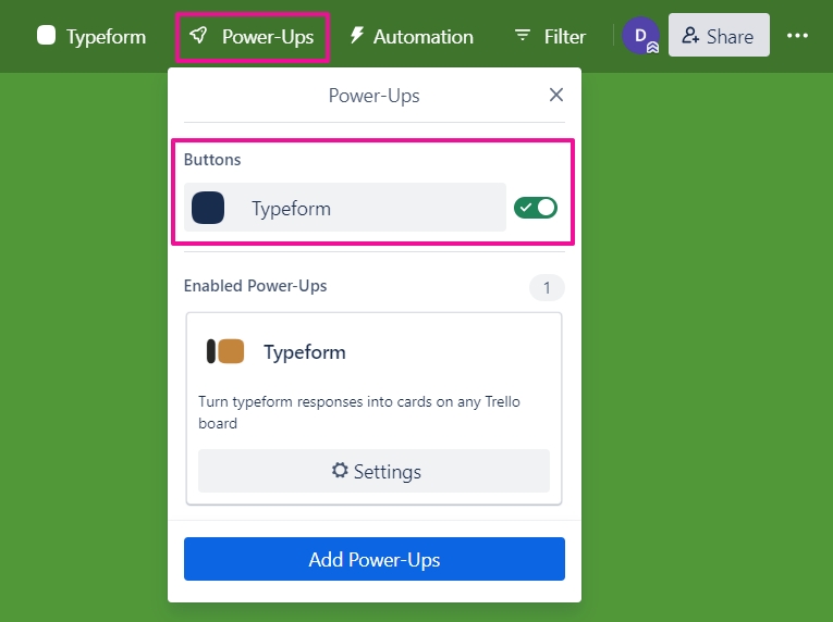 4) 상단 목록에서 [Power-Ups]를 클릭하여 Typeform 연동[on]으로 켜져 있는지 확인 해주세요.
