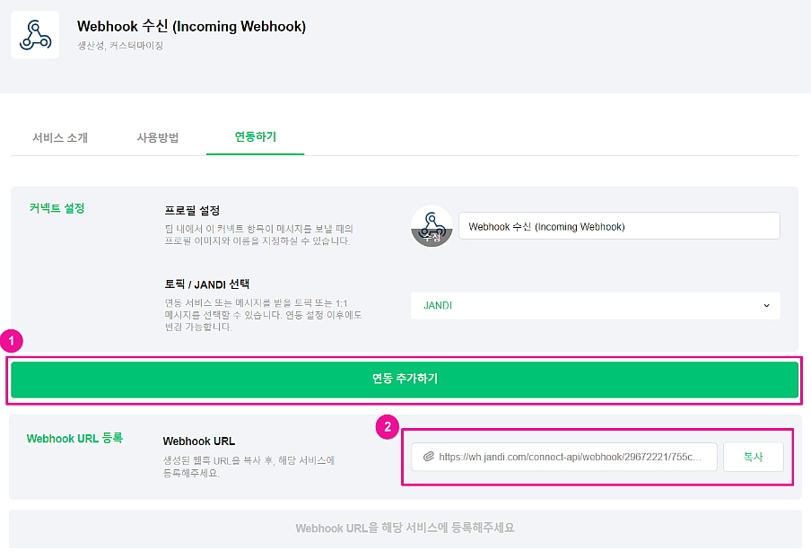 2) 메시지를 받을 토픽을 확인 후 [연동 추가하기] – Webhook URL 복사해 주세요. (*Zapier 설정 시 Webhook url 필요)