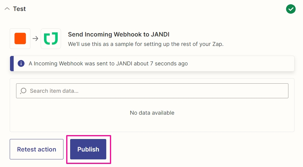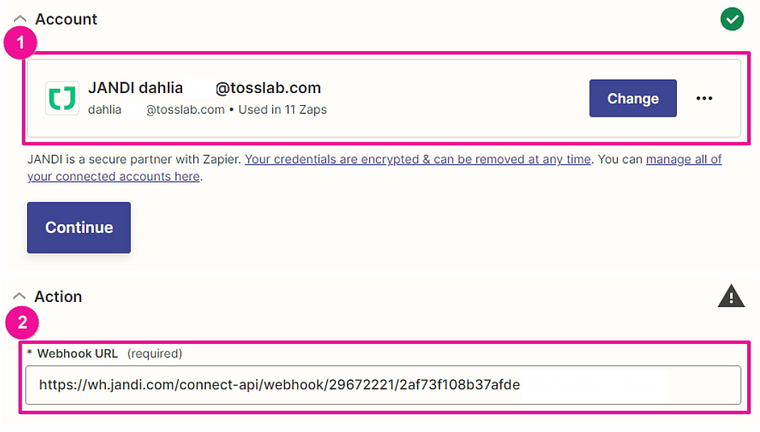 5) Action에서 JANDI 앱 선택 및 Event에서 [Send Incoming Webhook] – [Continue] 클릭 해주세요.