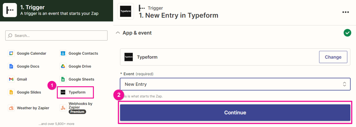 2) Trigger에서 Typeform 앱 선택 및 Event에서 [New Entry] – [Continue] 클릭해 주세요.