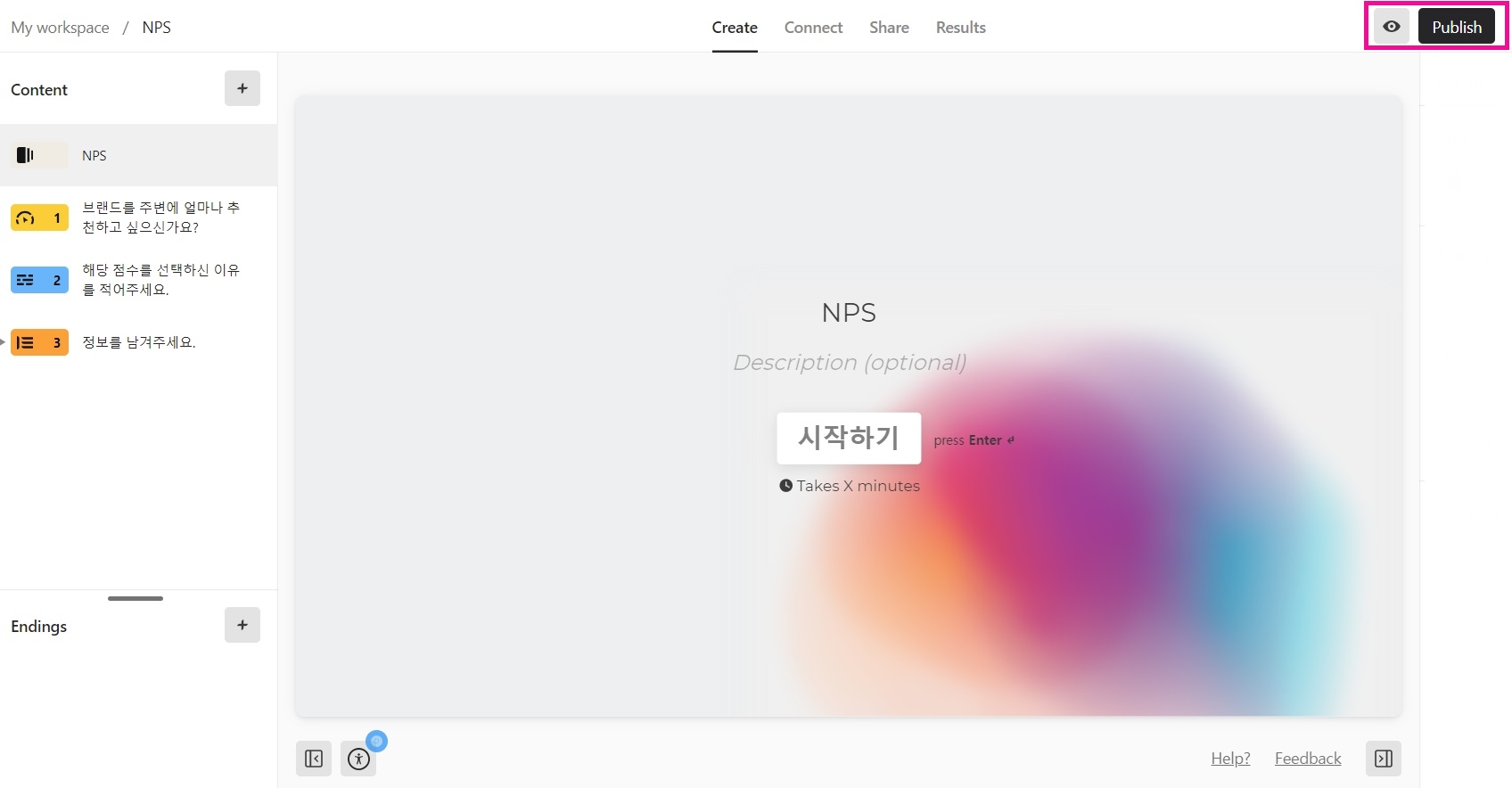 - 타입폼에서 원하는 설문 폼을 만들고, [Publish] 클릭 하여 응답할 수 있는 형태로 준비해 주세요.