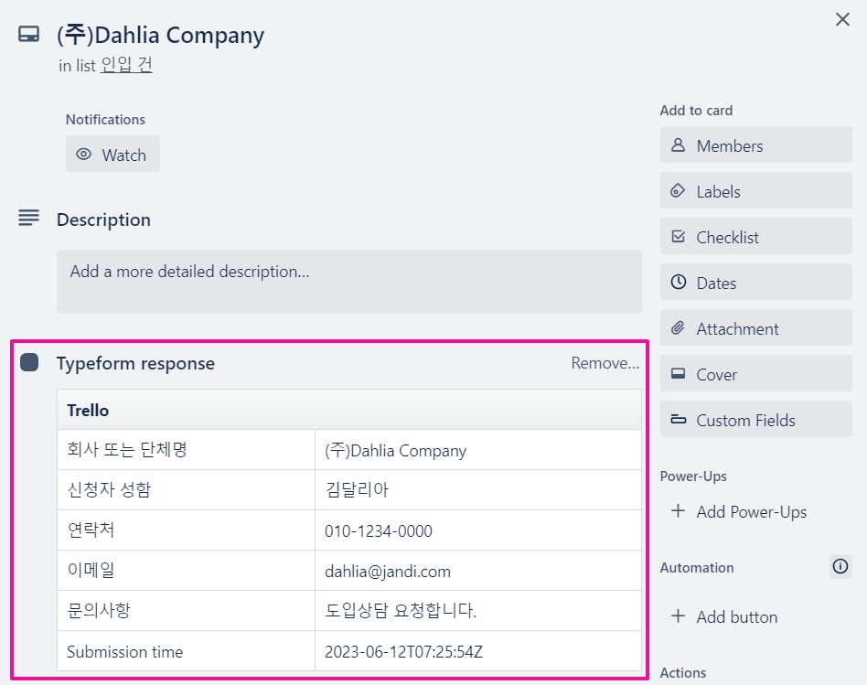 타입폼과 트렐로를 연동하여 고객정보 카드가 생성되고, 생성된 카드를 잔디에서 확인하면 빠른 소통으로 이어지고 진행 사항을 보드에서 관리할 수 있습니다.