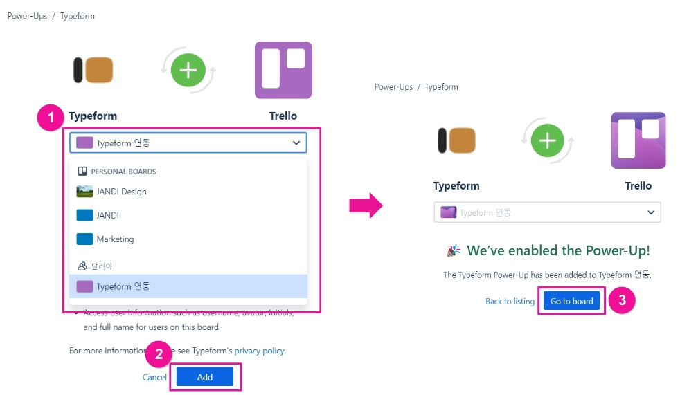 3) 연동하고자 하는 [Board]를 선택 후[Add]를 클릭하여 연동 후 [Go to board]를 클릭하여 트렐로 보드 화면으로 이동해 주세요.