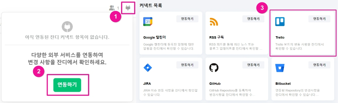 1) 잔디에서 토픽 우측 상단에 플러그 모양 [잔디 커넥트] – [연동하기] 클릭 후 커넥트 목록에서 Trello [연동하기] 클릭해 주세요.
