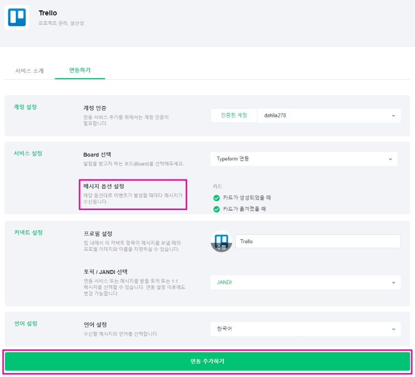 2) 알림 메시지를 받을 항목들을 선택한 후 [연동 추가하기] 클릭해 주세요!