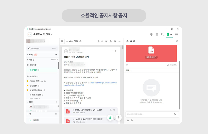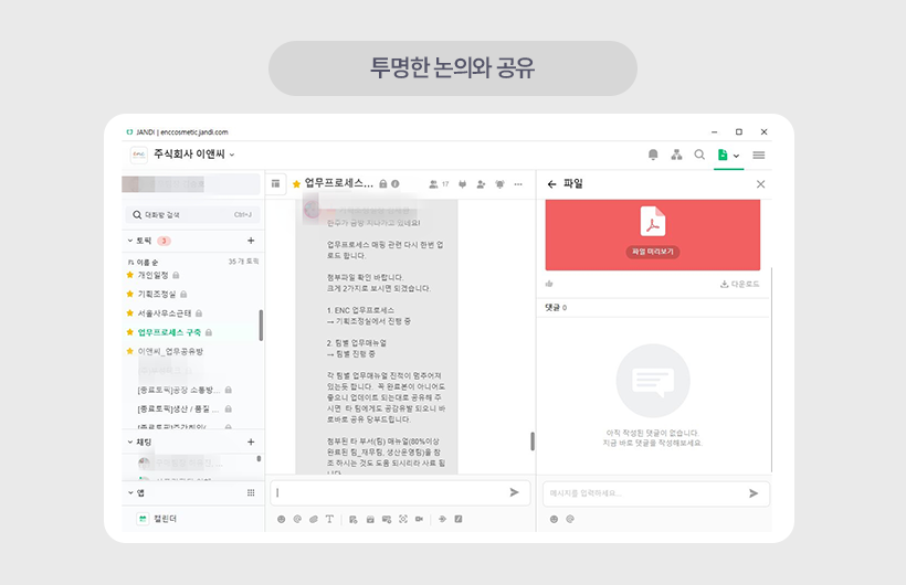 이앤씨는 특허 진행, 신제품 개발 등을 위한 프로젝트가 많습니다. 프로젝트를 시작할 때 토픽을 만들어 그 안에서 구성원의 자유로운 의사 표현을 진행하고 있는데요. 불필요한 회의를 줄이고 업무의 효율에 많은 도움이 되고 있습니다. 프로젝트가 끝나면 별도로 종료된 토픽을 표시하여 추후 다른 프로젝트 진행 시 참고할 수 있어 추천합니다.