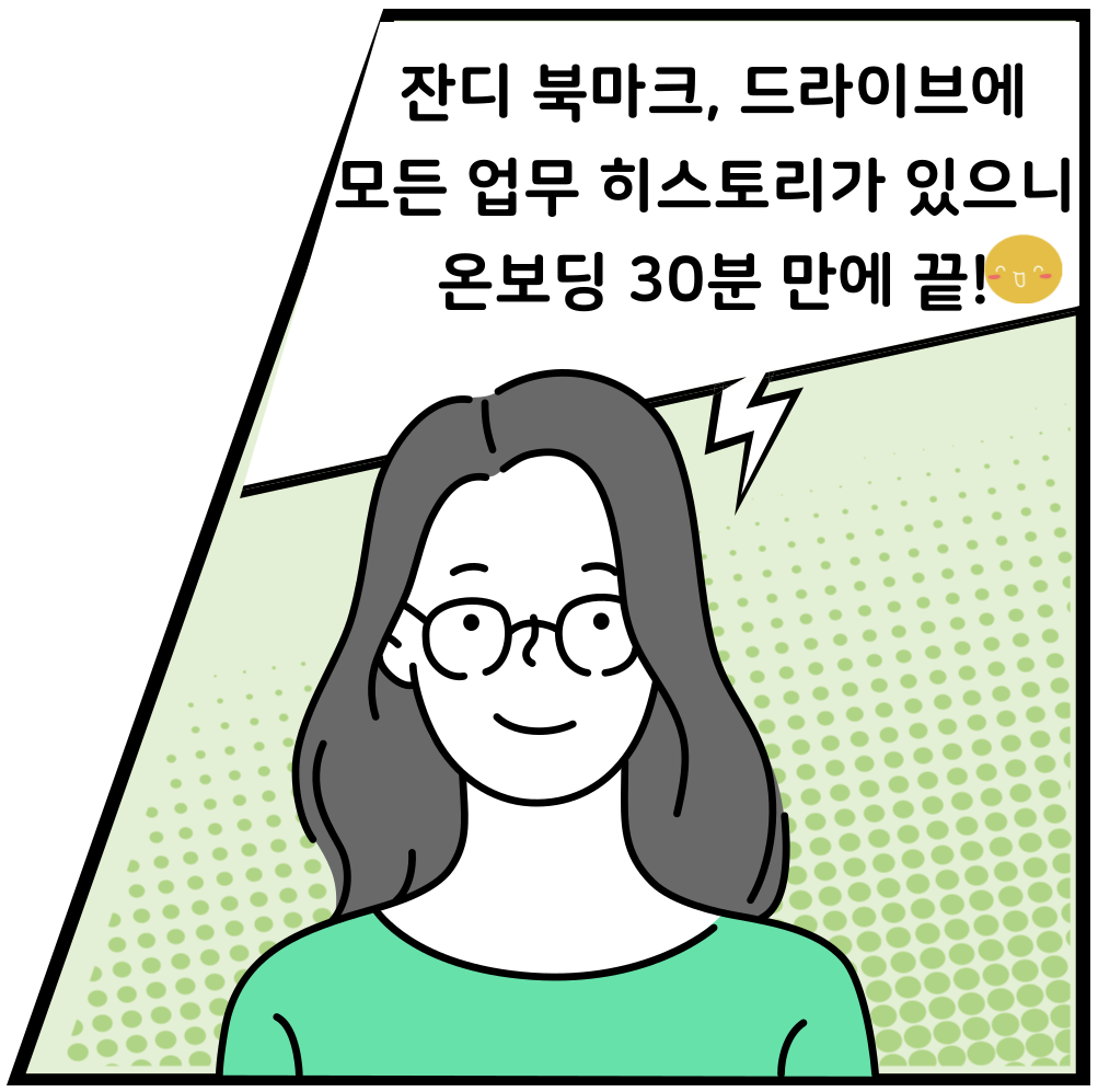 잔디 드라이브에 자료를 보관할 수 있어서 사내 규정, 기업 문화 파일을 찾아서 바로 온보딩을 진행할 수 있지!