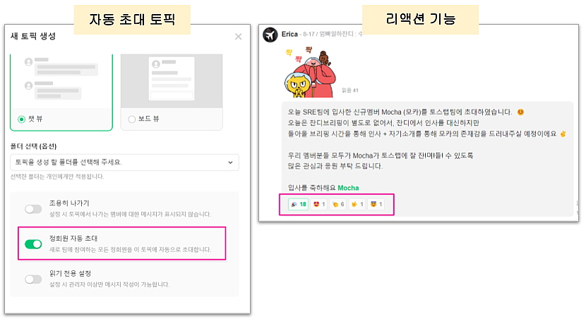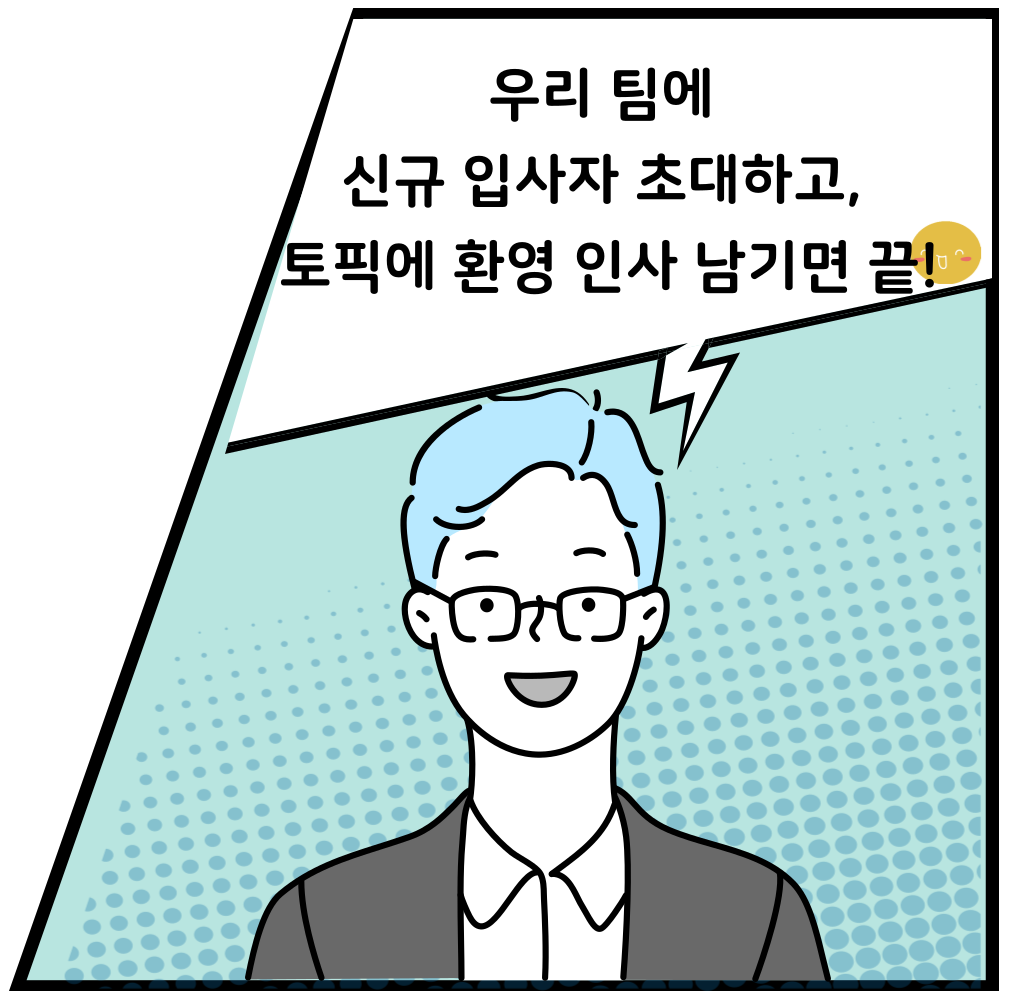 신규 입사자는 잔디로 초대하고, 모든 구성원이 포함 되어있는 전체토픽에 자동으로 초대까지 완료!신규 입사자의 소개와 함께 전체 구성원들이 따뜻하고 리액션 반응까지 보내준다면, 어색함이 사라지는 효과까지 얻을 수 있답니다👍🏻 자유롭게 참여할 수 있는 공개 토픽까지 공유하면서 사내 네트워킹까지 추천하는 HR팀의 센스😎