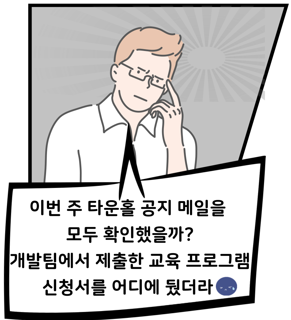 잔디 사용 전 : 신규 멤버에게 기업 문화와 가치를 알릴 중요한 자리여서 지난번 온보딩과 달리 추가된 사내 규정도 수정해야하는데…