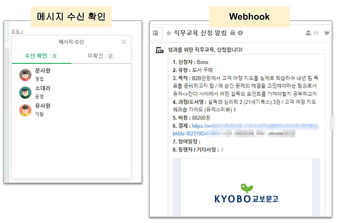 메시지 수신 확인을 통해 아직 미확인한 구성원을 바로 알 수 있지! Webhook을 통해 잔디와 구글 폼을 연동하면 번거로운 서류 제출을 안 해도 되고, 잔디 내에서 멤버들이 신청한 정보도 알 수 있으니 간편하네😎