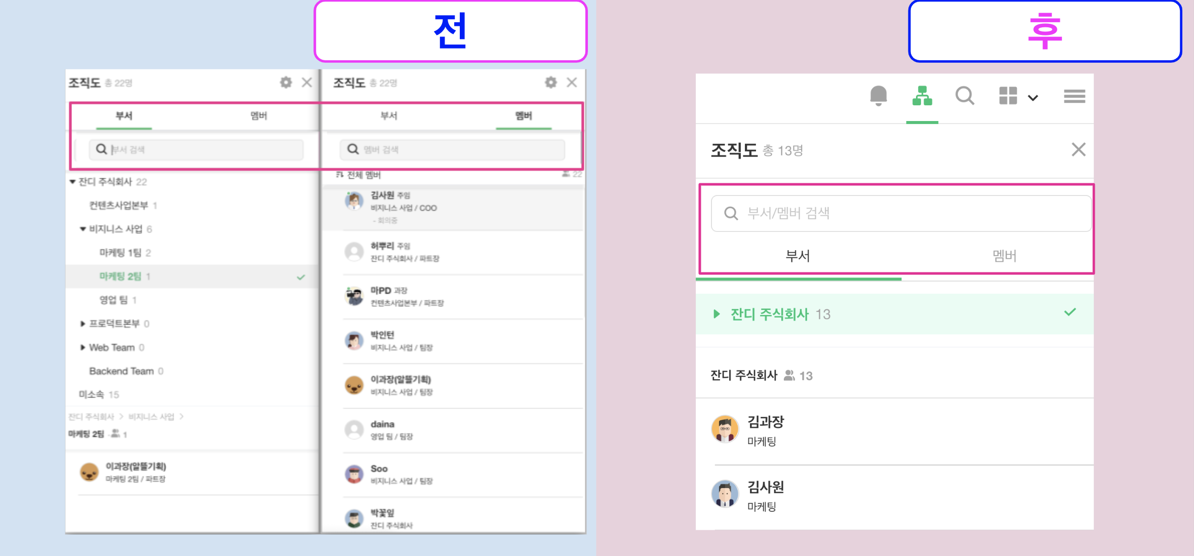 잔디 유저분들의 소중한 1분 1초를 위해서 부서/멤버 통합 검색으로 변경했습니다.