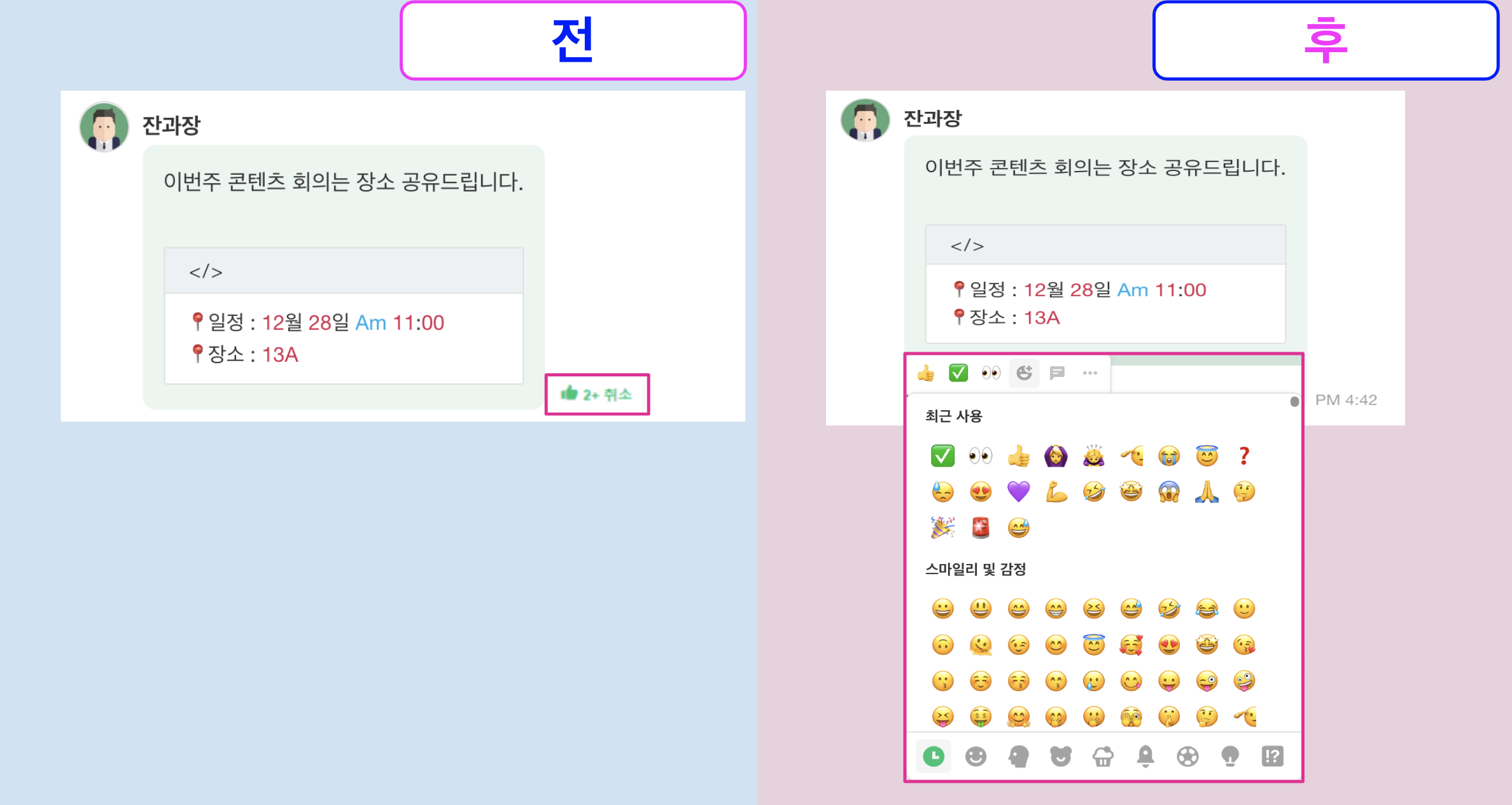 ‘👍’ 좋아요 단 한 개로 표현하기에는 부족하고, 이모티콘 보다 간단하게 공감하고 싶다는 VOC를 듣고, 신규 기능으로 업데이트했습니다.