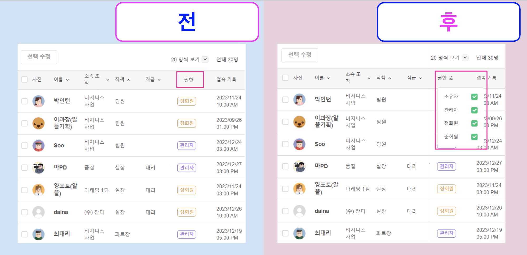 이젠, 멤버 관리에서 권한 별 멤버를 확인하고, 간편하게 멤버 관리할 수 있습니다!