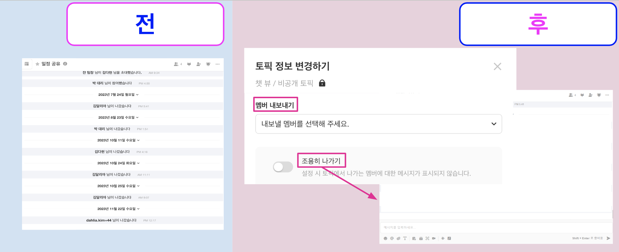👨: 멤버가 나갈 때마다 알림 메시지가 보이니까 신경 쓰이네…