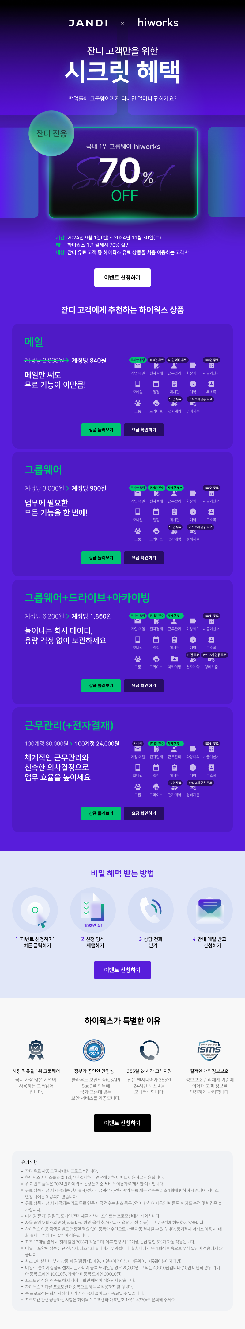 [잔디X하이웍스] 잔디 고객만을 위한 시크릿 혜택 게시일: 2024. 01. 01 Share 🕑 리딩타임: < 1 분 포스트 뷰: 460 가비아그룹웨어근무관리드라이브이메일 Share