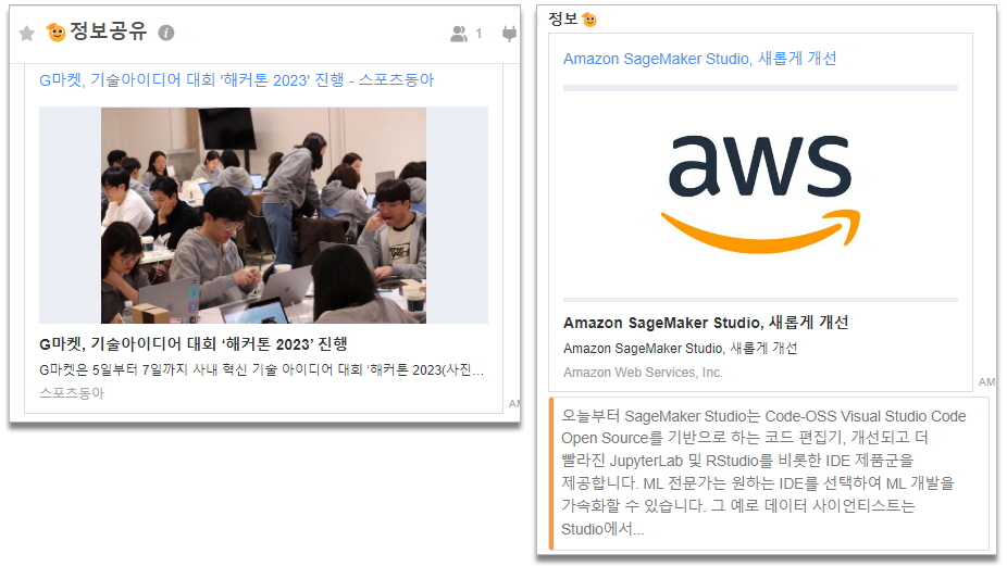요즘 진행하고 있는 해커톤은 어디서 개최하는지, AWS의 최신 기술을 통해 우리 서비스에 활용해 볼 수 있는 것은 없는지 잔디로 확인을 할 수 있다.