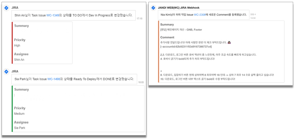타팀에서 전날 진행했던 업무를 잔디와 연동해 놓은 Jira 알림을 통해 바로 확인할 수 있어서 협업하고 있는 구성원에게 물어보지 않아도 빠른 업무 파악이 가능하지😎