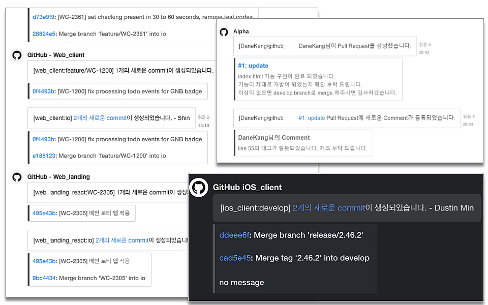멤버들에게 ‘요청합니다’ 이야기하지 않아도 토픽에 연동된 GitHub 알림을 통해 멤버들이 바로 인지 가능하다.