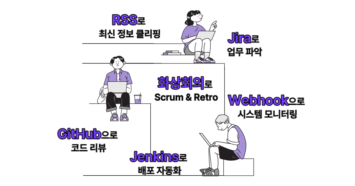 내가 지금 어떤 업무를 하고 있는지, 진행은 어느 정도 됐는지, 타 팀에 체크를 요청해야 하는 건 없는지 이야기를 나누는 Scrum을 매일 진행하고,