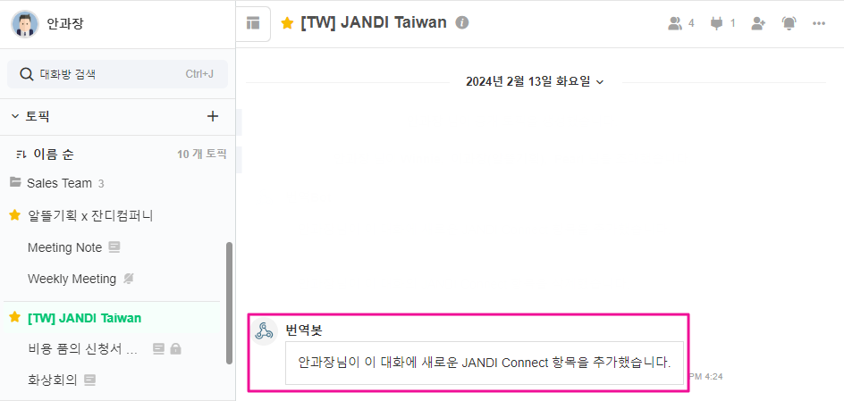 1-1) 번역 봇을 연동할 토픽 우측 상단에 플러그 모양 [잔디 커넥트] – [연동하기]를 클릭해 주세요.
