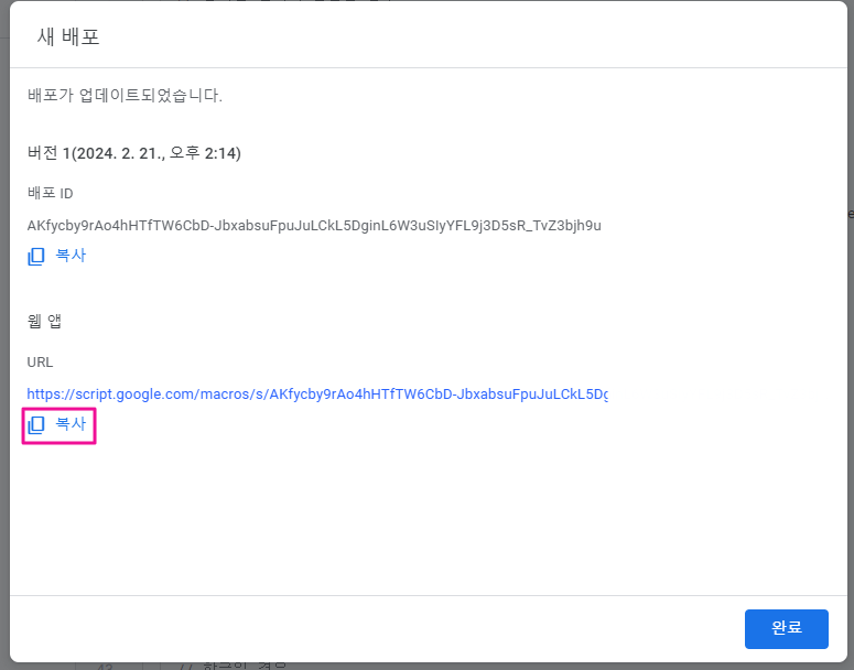 2-10) 웹 앱의 URL을 복사한 후 [완료] 버튼을 눌러주세요! (*Outgoing Webhook 설정 시 Webhook Url필요)