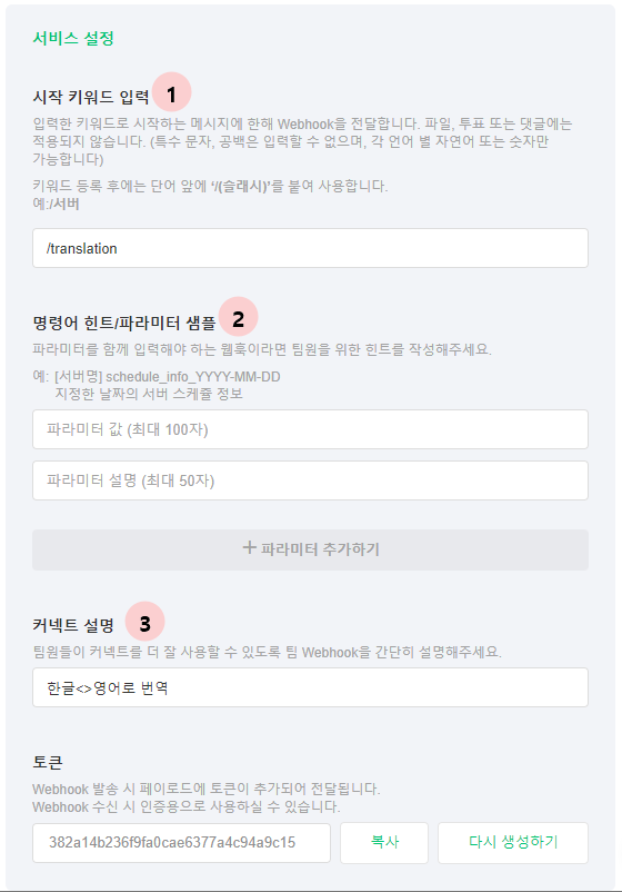 ② 번역 봇의 경우 번역을 해야 할 단어 또는 문장을 입력해야 되기 때문에 ‘파라미터값’과 ‘파라미터 설명’을 별도로 넣지 않을게요.