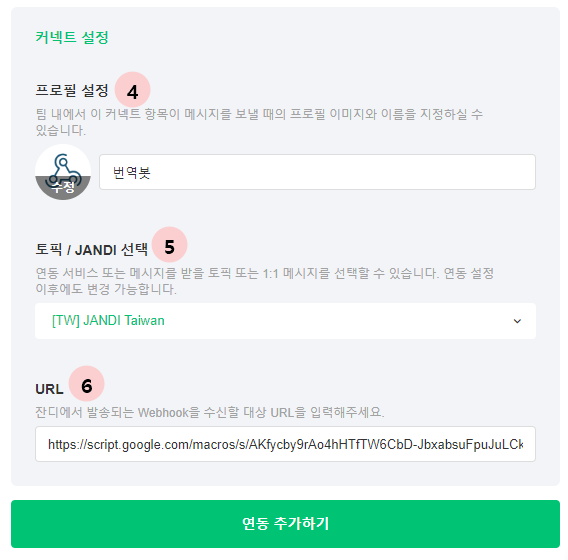 1-3) 웹훅 세부 사항을 설정한 후에 [연동 추가하기] 버튼을 클릭해 주세요.