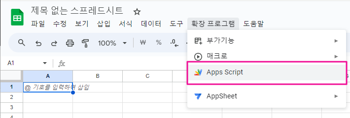 2-1) Google 로그인 후에 [구글 스프레드시트]를 생성 -> [확장 프로그램] -> [Apps Script] 선택해 주세요.