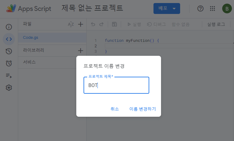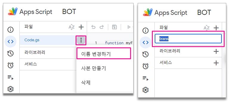 2-3) code.gs 옆 […] -> 이름 변경하기 -> trans.gs로 변경합니다.