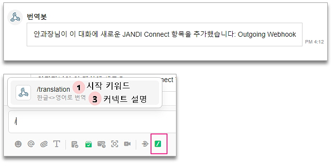 메시지 입력창에 ‘/(커맨드)’ 혹은 ‘/(커맨드) 아이콘 클릭’ 으로 웹훅을 실행해주세요.