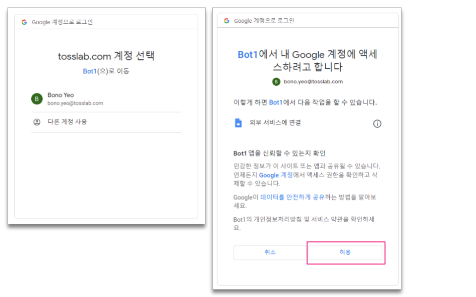 2-7) 구글 계정을 선택한 후, 구글 계정에 엑세스를 [허용] 해주세요.