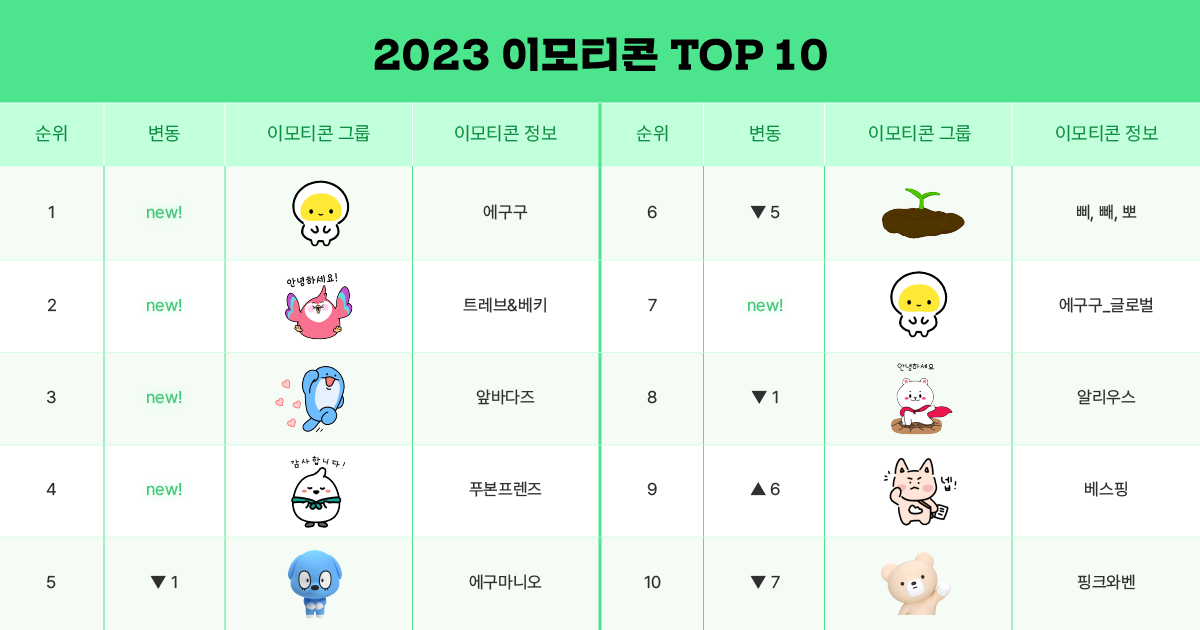 2023년에는 신규 이모티콘이 잔디 유저에게 특히 많은 사랑을 받았습니다. 그중에서도 2023년 처음 입점한 ‘에구구’ 그룹은 전체 이모티콘 사용량의 약 22%를 차지하면서 173개의 이모티콘 중 사용량으로 1위를 차지했습니다. ‘어쩌다 깨진 달걀 에구구’가 잔디 유저들 사이에서 폭발적인 인기를 얻은 이유는 ‘감사합니다’, ‘짝짝짝짝’, ‘넵’, ‘좋아좋아’, ‘치어리딩’으로 표현되는 친근한 인사와 긍정적인 피드백을 표현하는 이모티콘이기 때문입니다.