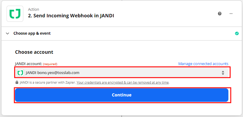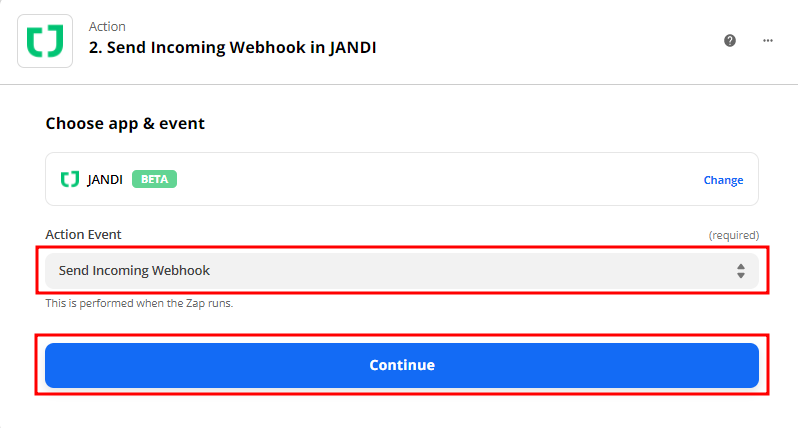 3-4. Action 단계에서 잔디(JANDI) 앱을 선택해주세요