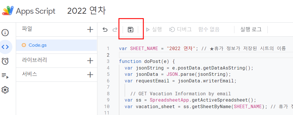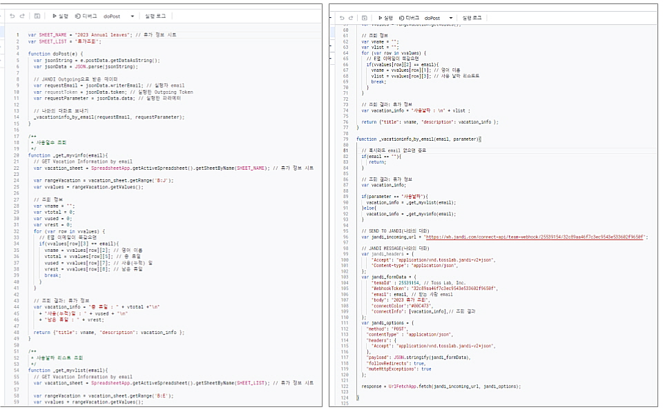 var SHEET_NAME = "2023 Annual leaves"; // 휴가 정보 시트 var SHEET_LIST = "휴가조회"; function doPost(e) { var jsonString = e.postData.getDataAsString(); var jsonData = JSON.parse(jsonString); // JANDI Outgoing으로 받은 데이터 var requestEmail = jsonData.writerEmail; // 실행자 email var requestToken = jsonData.token; // 실행한 Outgoing Token var requestParameter = jsonData.data; // 실행한 파라메터 // 나와의 대화로 보내기 _vacationinfo_by_email(requestEmail, requestParameter); } /** * 사용일수 조회 */ function _get_myvinfo(email){ // GET Vacation Information by email var vacation_sheet = SpreadsheetApp.getActiveSpreadsheet().getSheetByName(SHEET_NAME); // 휴가 정보 시트 var rangeVacation = vacation_sheet.getRange('B:J'); var vvalues = rangeVacation.getValues(); // 조회 정보 var vname = ""; var vtotal = 0; var vused = 0; var vrest = 0; for (var row in vvalues) { // E열 이메일이 똑같으면 if(vvalues[row][3] == email){ vname = vvalues[row][2]; // 영어 이름 vtotal = vvalues[row][5]; // 총 휴일 vused = vvalues[row][7]; // 사용(누적) 일 vrest = vvalues[row][8]; // 남은 휴일 break; } } // 조회 결과: 휴가 정보 var vacation_info = "총 휴일 : " + vtotal +"n" + "사용(누적)일 : " + vused + "n" + "남은 휴일 : " + vrest; return {"title": vname, "description": vacation_info }; } /** * 사용날짜 리스트 조회 */ function _get_myvlist(email){ // GET Vacation Information by email var vacation_sheet = SpreadsheetApp.getActiveSpreadsheet().getSheetByName(SHEET_LIST); // 휴가 정보 시트 var rangeVacation = vacation_sheet.getRange('B:E'); var vvalues = rangeVacation.getValues(); // 조회 정보 var vname = ""; var vlist = ""; for (var row in vvalues) { // E열 이메일이 똑같으면 if(vvalues[row][2] == email){ vname = vvalues[row][1]; // 영어 이름 vlist = vvalues[row][3]; // 사용 날짜 리스트트 break; } } // 조회 결과: 휴가 정보 var vacation_info = "사용날짜 : n" + vlist ; return {"title": vname, "description": vacation_info }; } function _vacationinfo_by_email(email, parameter){ // 혹시라도 email 없으면 종료 if(email == ""){ return; } // 조회 결과: 휴가 정보 var vacation_info; if(parameter == "사용날짜"){ vacation_info = _get_myvlist(email); }else{ vacation_info = _get_myvinfo(email); } // SEND TO JANDI(나와의 대화) var jandi_incoming_url = "https://wh.jandi.com/connect-api/team-webhook/279/00a078ae1e855da206fb98be780f999f"; // JANDI MESSAGE(나와의 대화) var jandi_headers = { "Accept": "application/vnd.tosslab.jandi-v2+json", "Content-type": "application/json", }; var jandi_formData = { "temaId" : 279, // Toss Lab, Inc. "WebhookToken": "00a078ae1e855da206fb98be780f999f", "email": email, // 받는 사람 email "body": "2023 휴가 조회", "connectColor":"#00C473", "connectInfo": [vacation_info],// 조회 결과 }; var jandi_options = { "method": "POST", "contentType" : "application/json", "headers": { "Accept": "application/vnd.tosslab.jandi-v2+json", }, "payload": JSON.stringify(jandi_formData), "followRedirects": true, "muteHttpExceptions": true }; response = UrlFetchApp.fetch(jandi_incoming_url, jandi_options); }