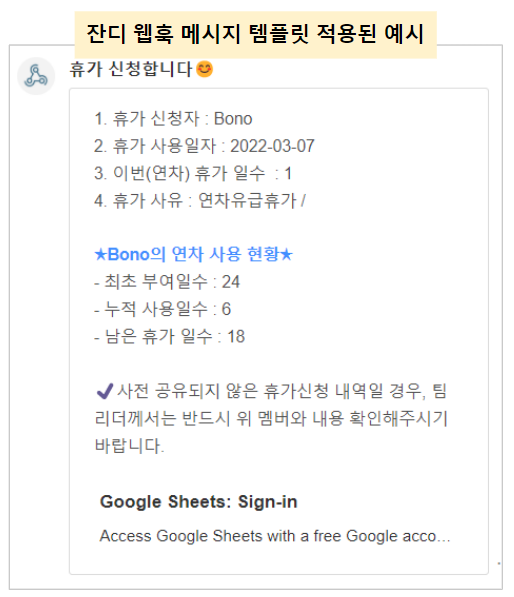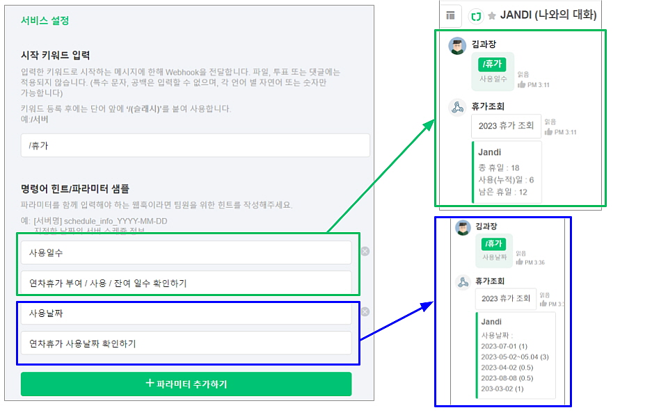 - 명령어 힌트 / 파라미터 샘플 : 파라미터와 함께 입력이 필요한 웹훅이라면 작성해주세요! 잔디 팀에서는 휴가 사용날짜와 부여된 휴가 / 사용 / 잔여 일수 확인을 할 수 있도록 설정하였습니다.