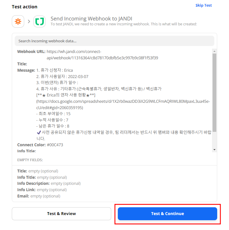 - [TEST & CONTINUE] 버튼을 눌러 정상적으로 잔디 메시지가 들어오는지 테스트를 진행해요!