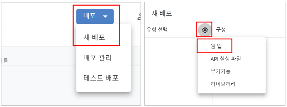 - 우측 상단 [배포] > [새 배포] > 유형 선택 옆 [톱니바퀴] > [웹앱]을 선택해 주세요.