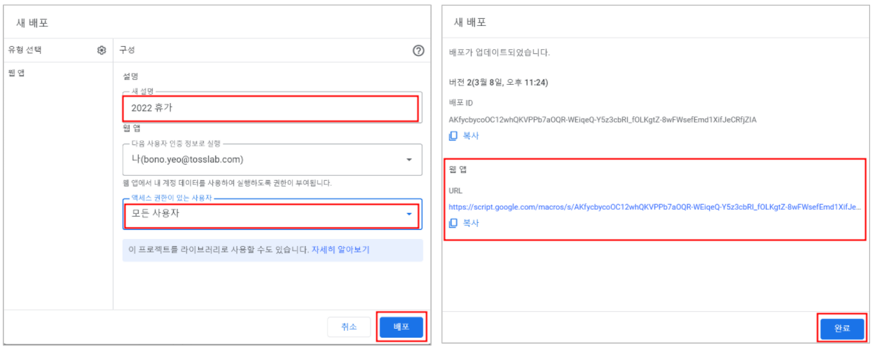 - 설명은 자유롭게 작성하고, 엑세스 권한은 [모든 사용자]로 설정 후 [배포] 버튼을 눌러주세요.