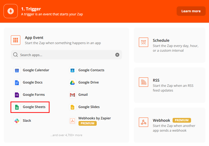 3-2. Trigger 단계에서 구글 시트(Google Sheets) 앱을 선택해주세요