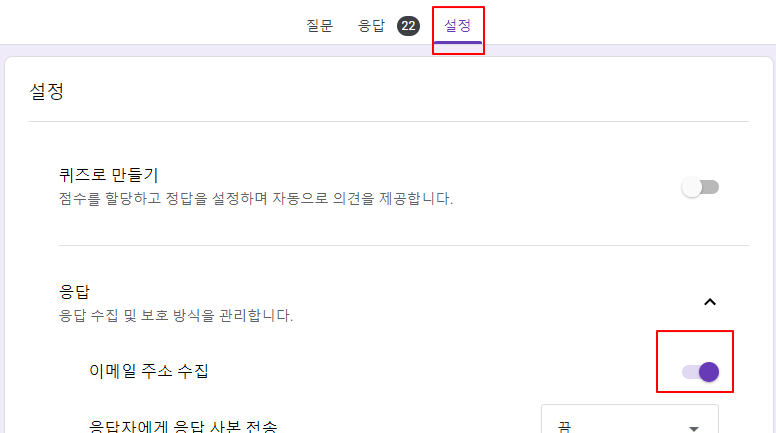 1-3. [설정]에서 이메일 주소 수집을 활성화하게 되면 휴가 응답 구글 시트에 이메일과 함께 수집됩니다.