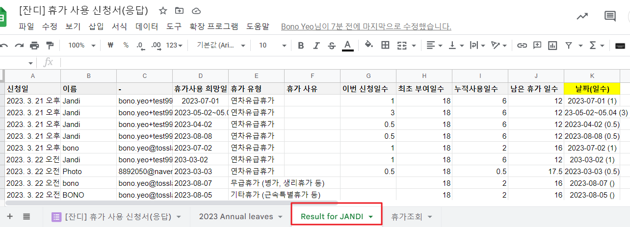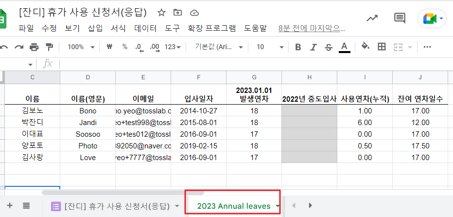 - 휴가 신청이 관리되는 휴가 신청서(응답) 스프레드시트 옆에, 새로운 시트를 생성해서 멤버들의 기본 인적 정보와 올해 연차 현황을 추가해 주세요. (i.e. 2023 Annual leaves 시트)