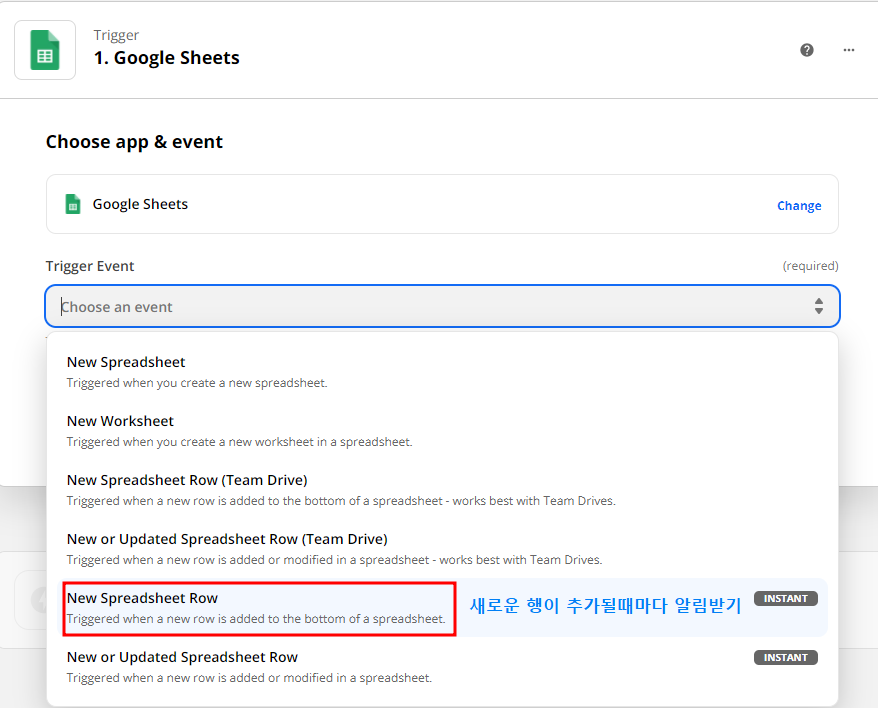 - New Spreadsheet Row로 새로운 행 내용이 들어올 때마다 알림 받기로 선택할게요.