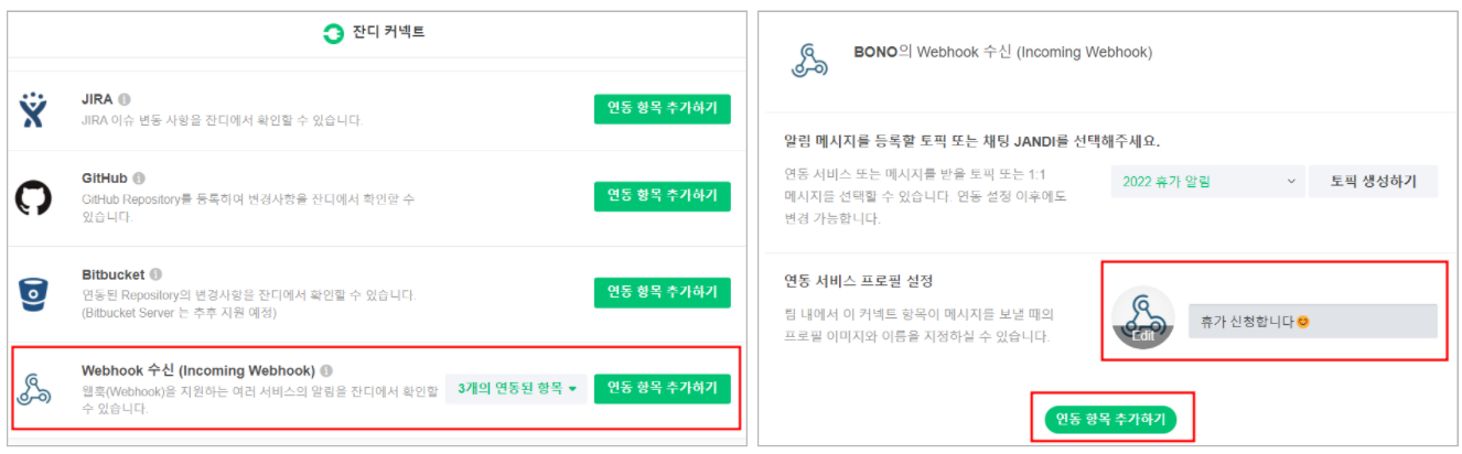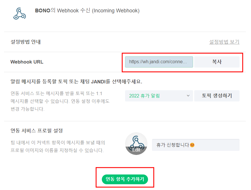 1. 휴가 신청 알림을 받을 수 있는 토픽 생성, 잔디 커넥트 Incoming Webhook 연동하기