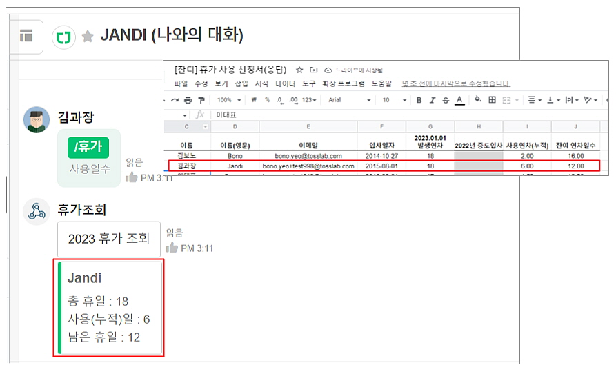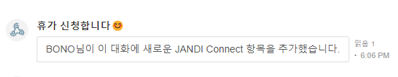 잔디팀은 Team incoming Webhook / Team Outgoing Webhook을 생성해서, JANDI (나와의 대화)로 개인별 휴가 조회 수신이 가능하도록 설정되어 있어요. (*유료 플랜에서 제공)