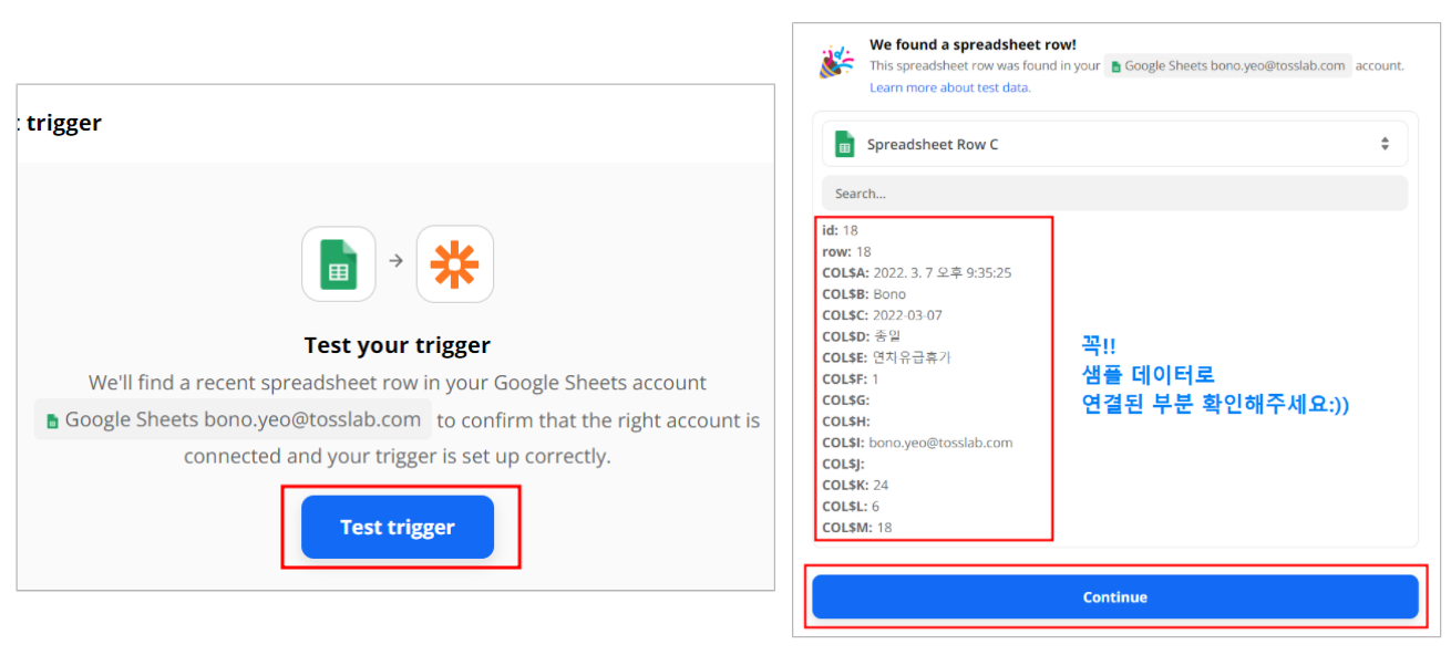 - Test tigger 버튼을 눌러 정상적으로 데이터들이 연결되었는지 확인해 주세요. 테스트가 정상적으로 진행되지 않으면 연동이 잘되지 않고 에러가 나는 경우가 많아요.