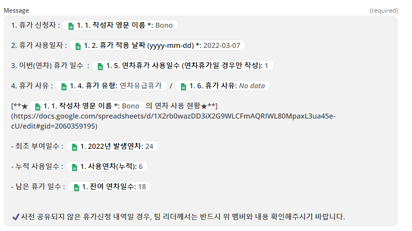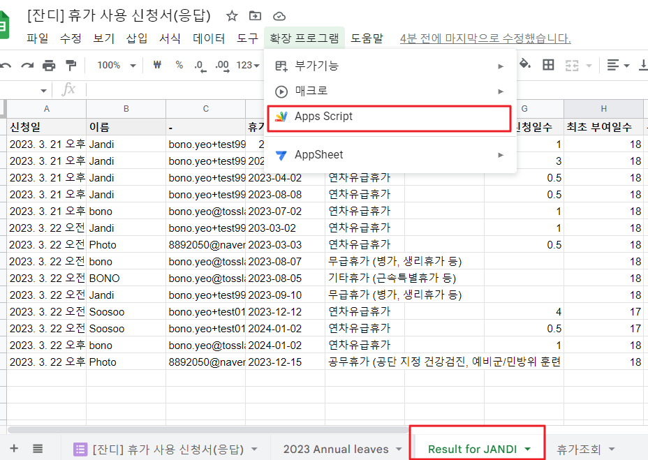 새로운 휴가 신청이 들어올 때마다 새로운 시트에 행이 입력되기 때문에 알림을 받는 형식이에요.