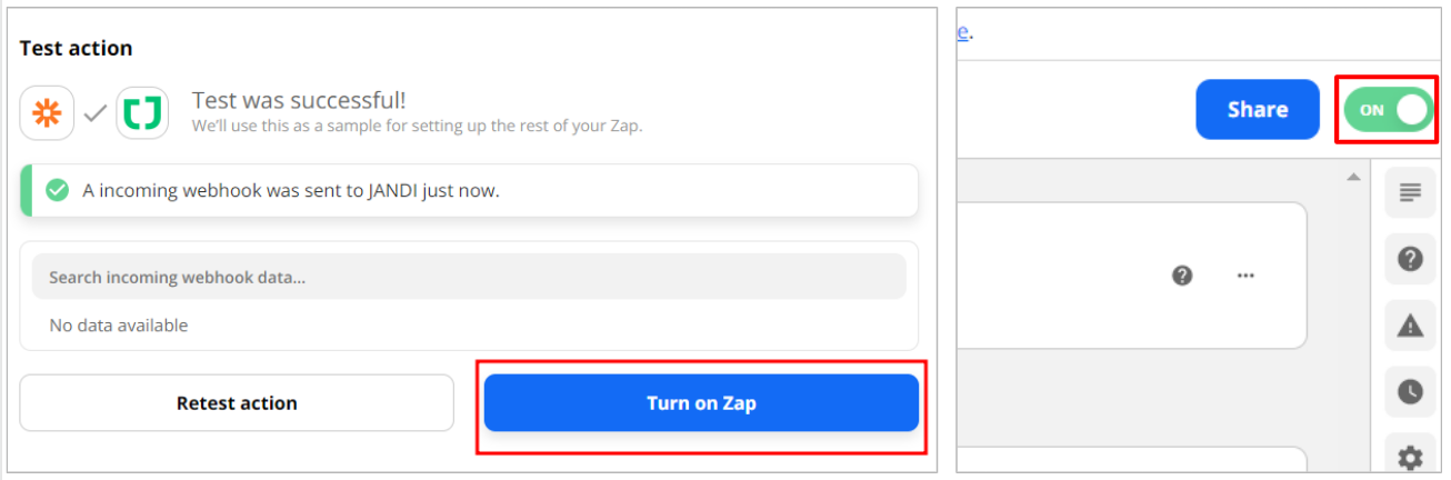 - 이제 마지막입니다~! [Turn on Zap] 을 클릭하게 되면 우측 상단이 On으로 변경된 걸 확인할 수 있어요.