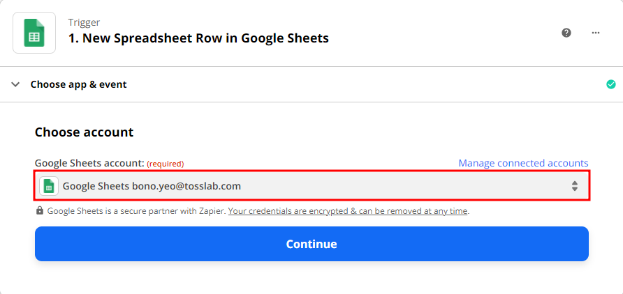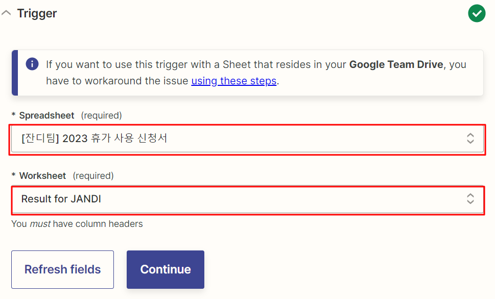 - 휴가 신청이 정리되고 있는 구글 스프레드시트(Spreadsheet)와 세부 워크시트(Worksheet) 항목을 선택해 주세요. 완료 후 [CONTINUE] 버튼을 클릭해 다음 단계로 넘어갈게요.